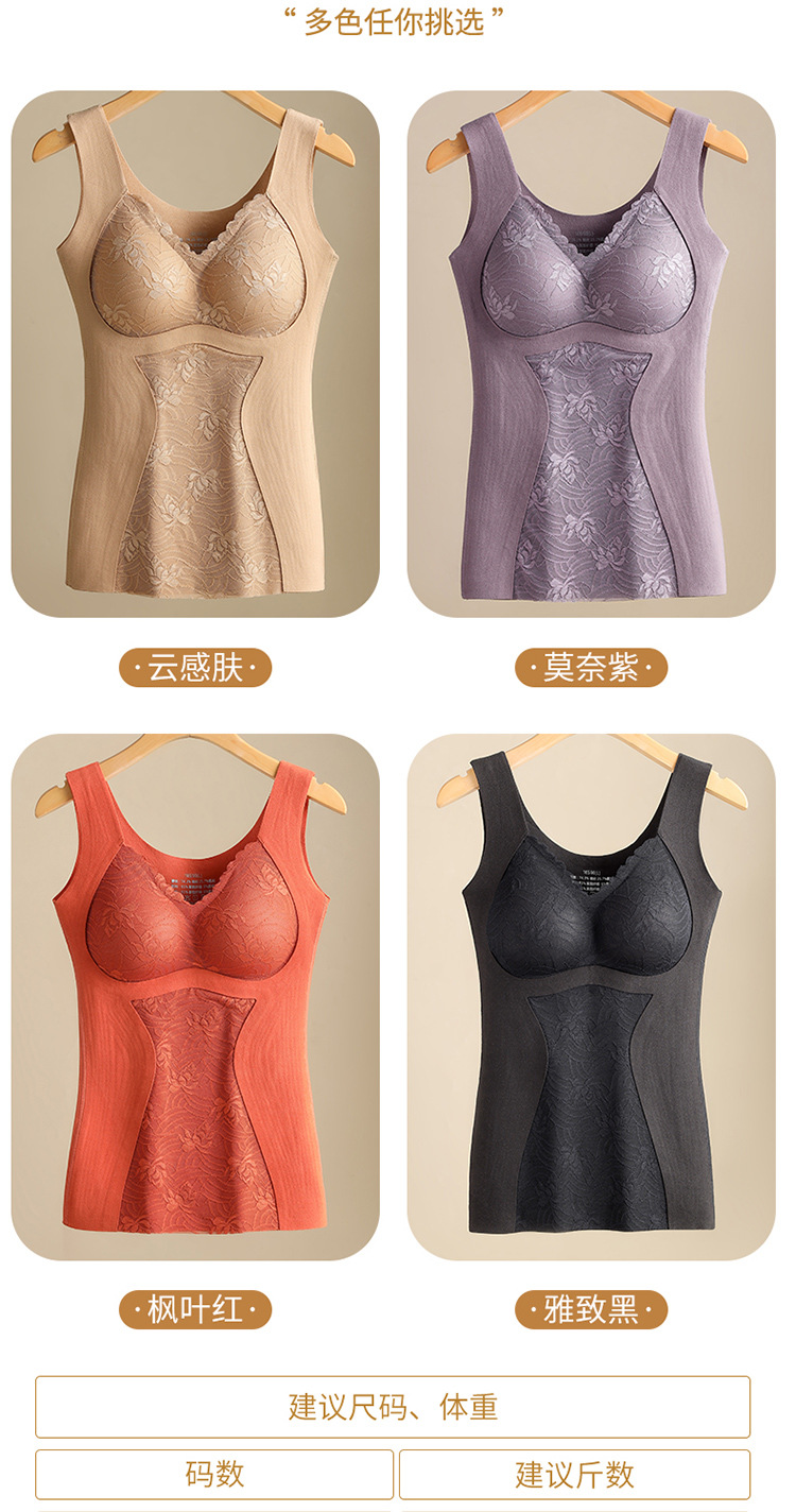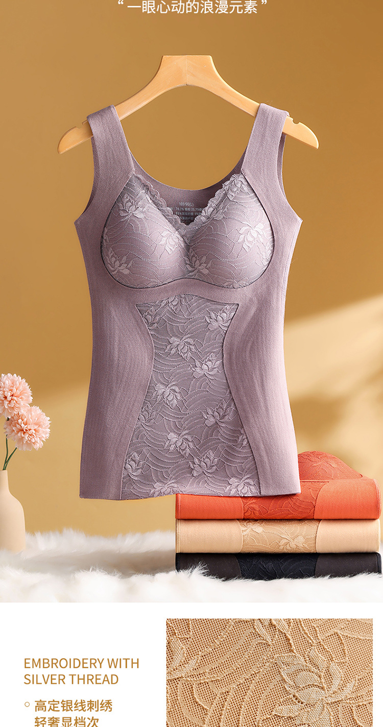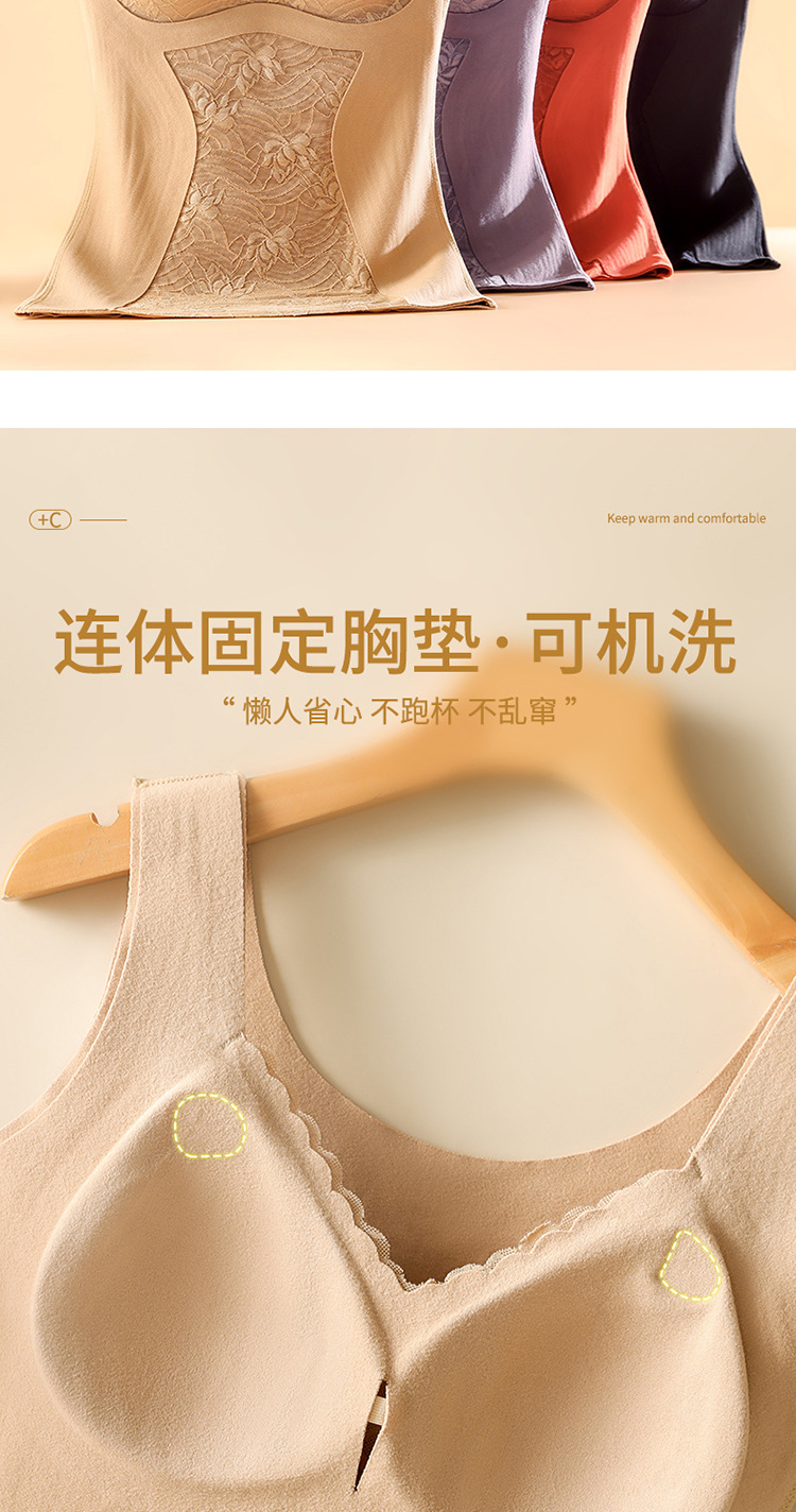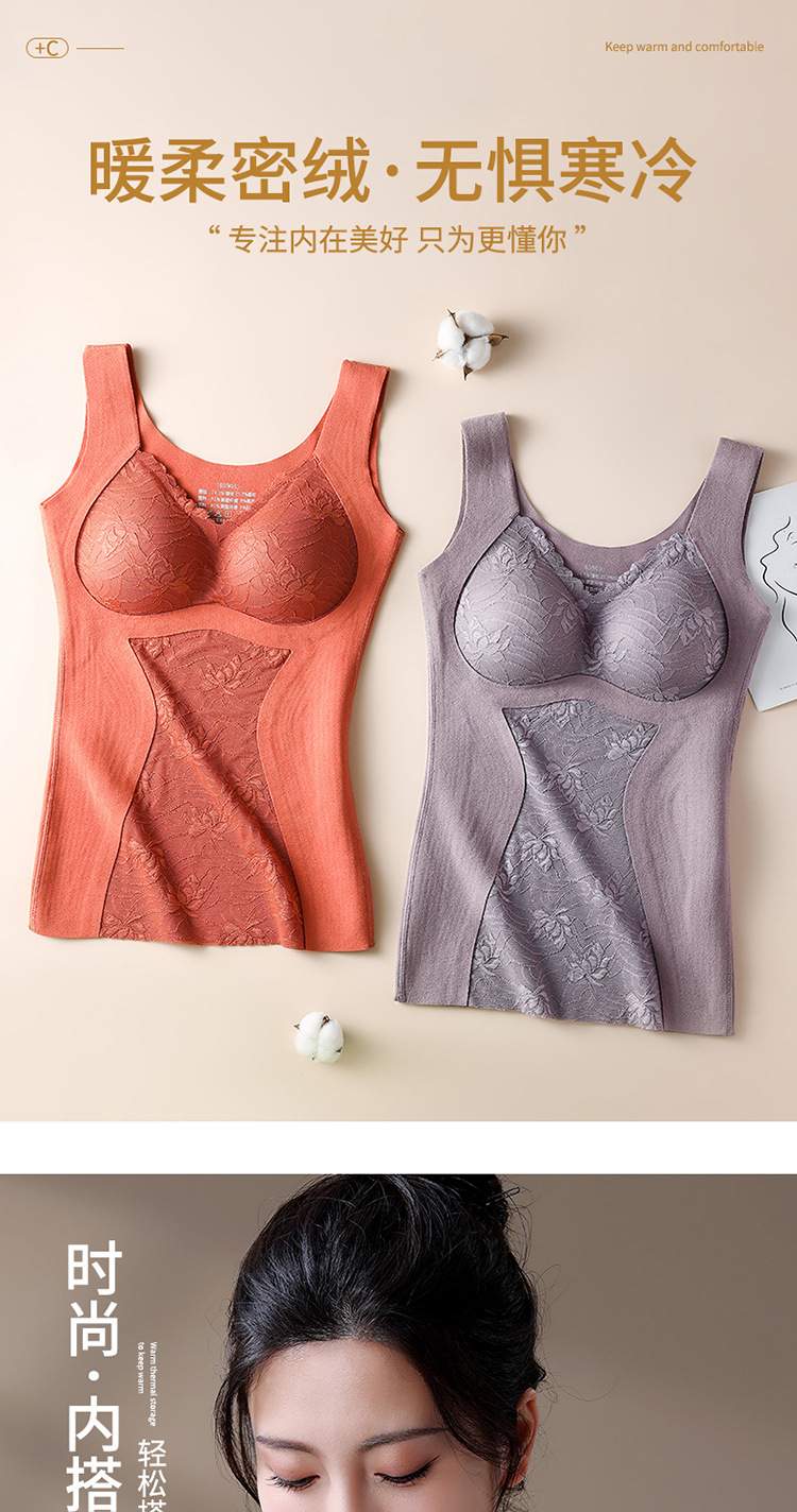 定制保暖内衣女秋冬蕾丝德绒背心固定一体杯打底加厚上衣修身大码