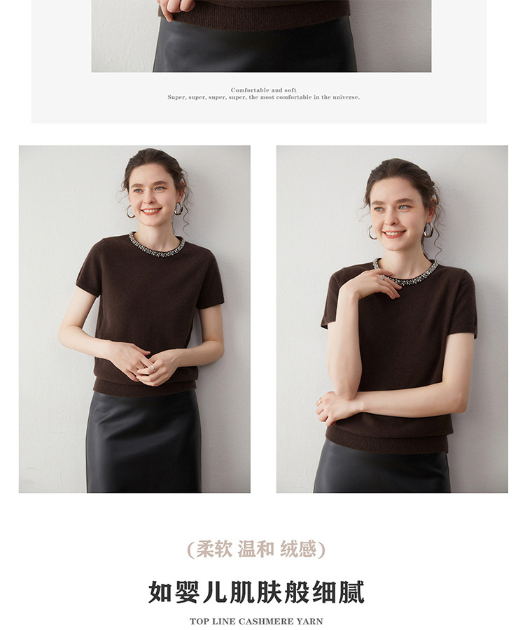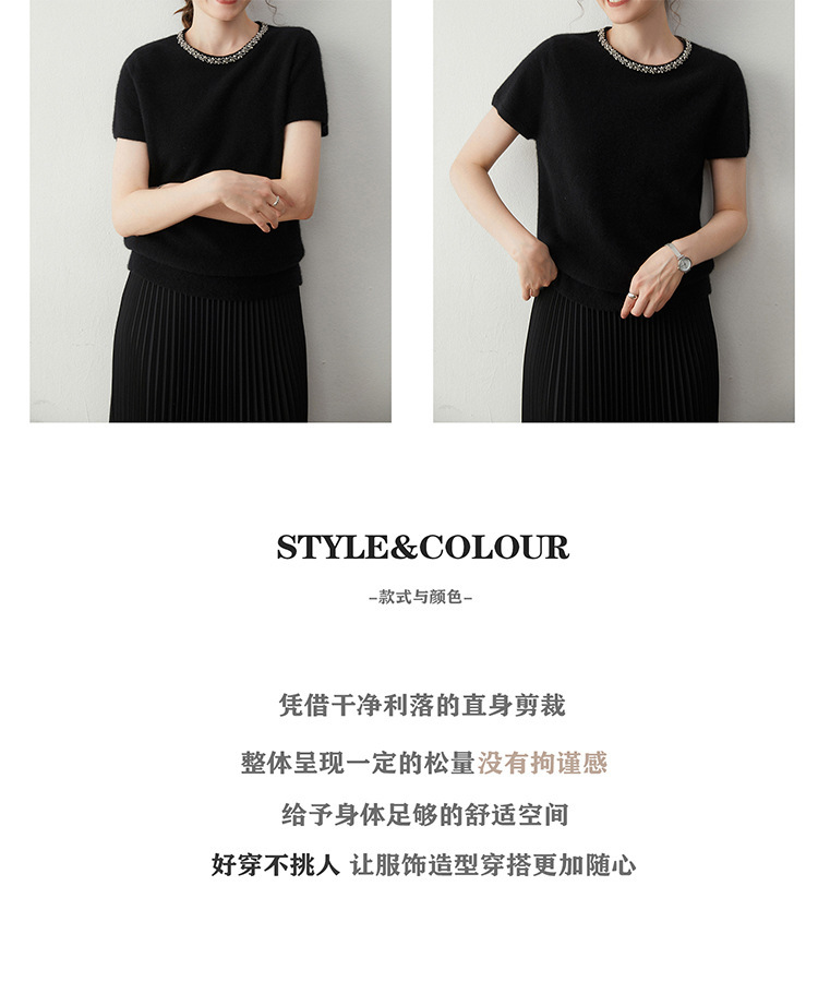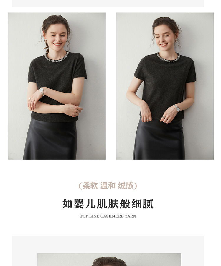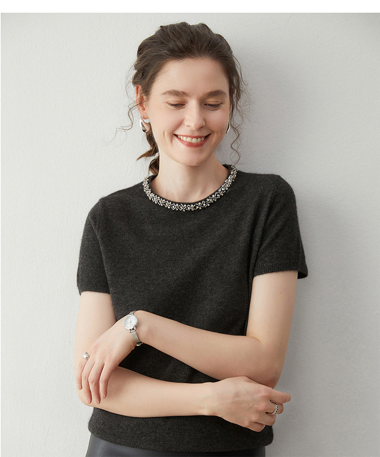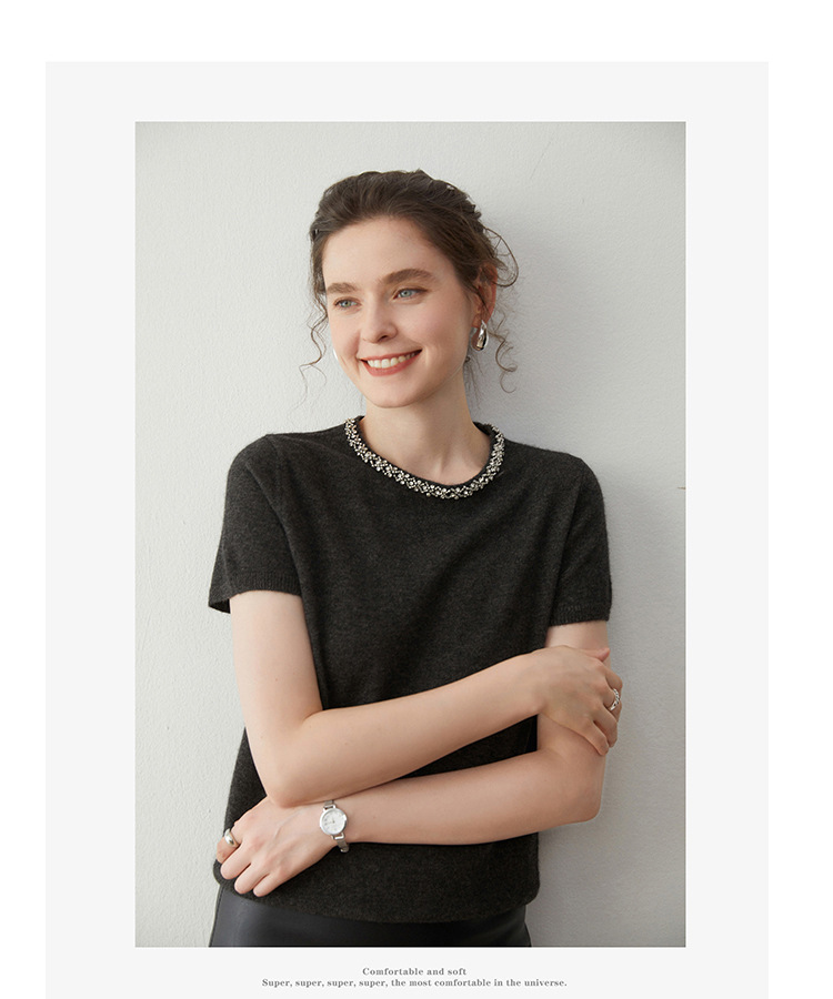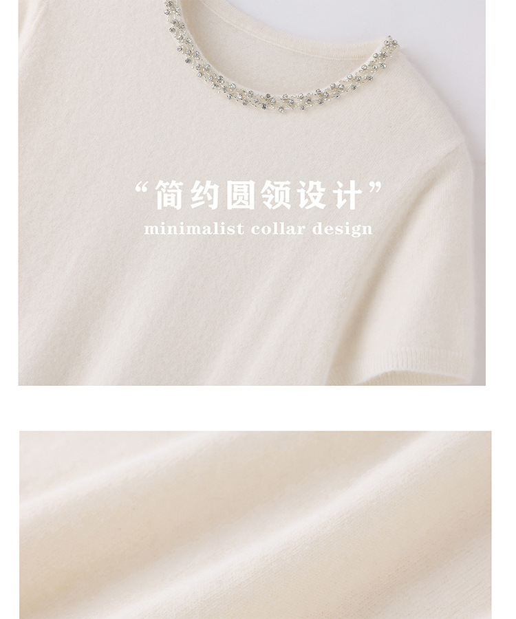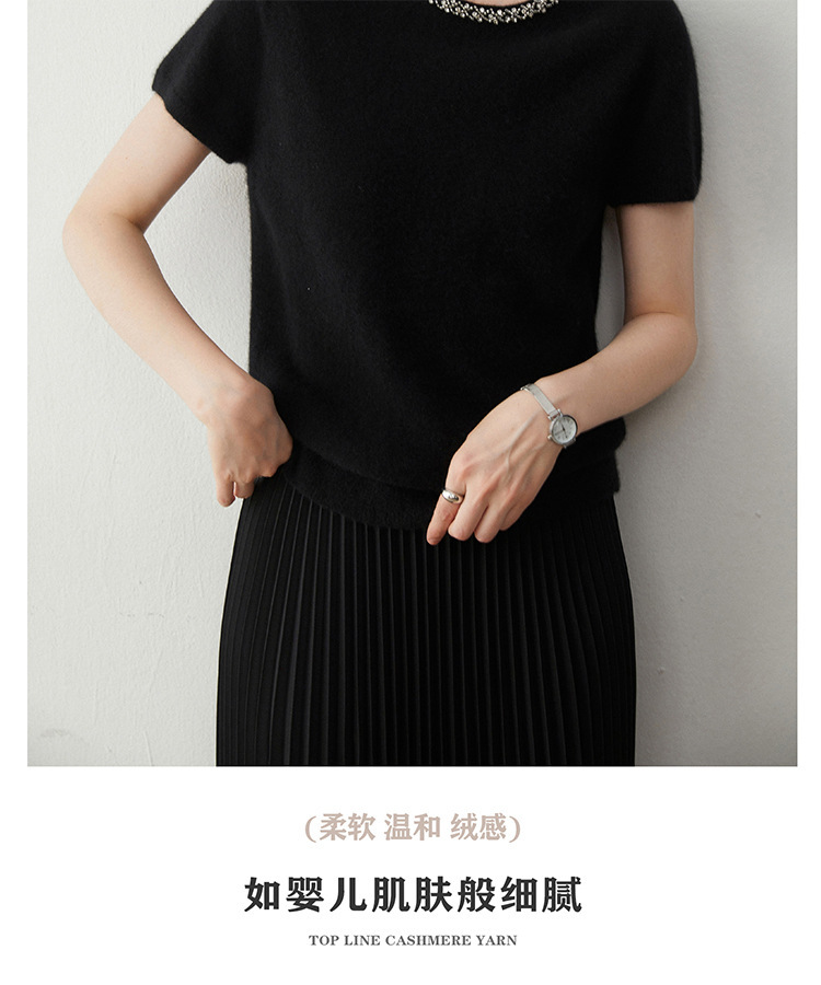 韩国新款山羊绒衫女轻奢镶钻气质显白短袖亲肤圆领针织毛衫打底衫