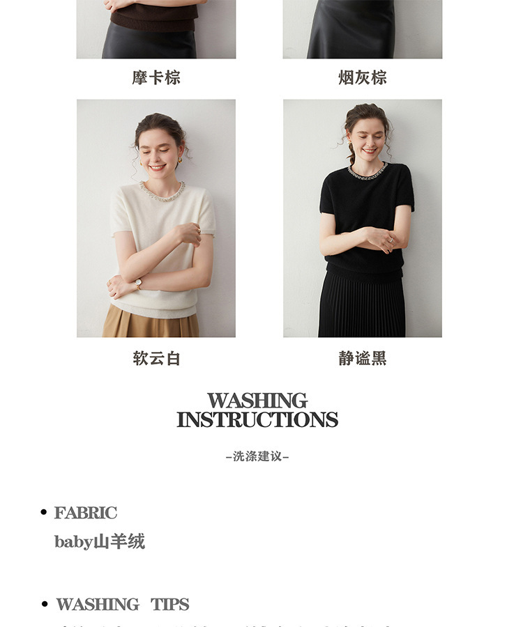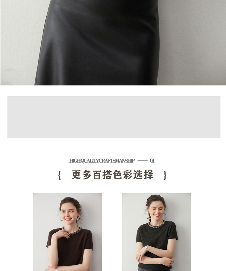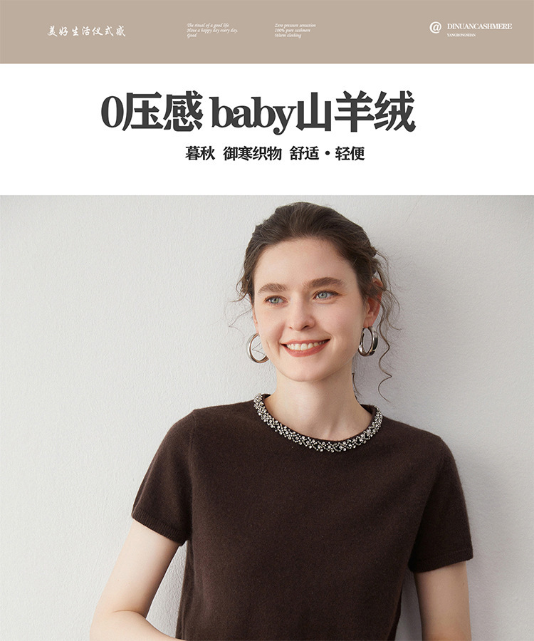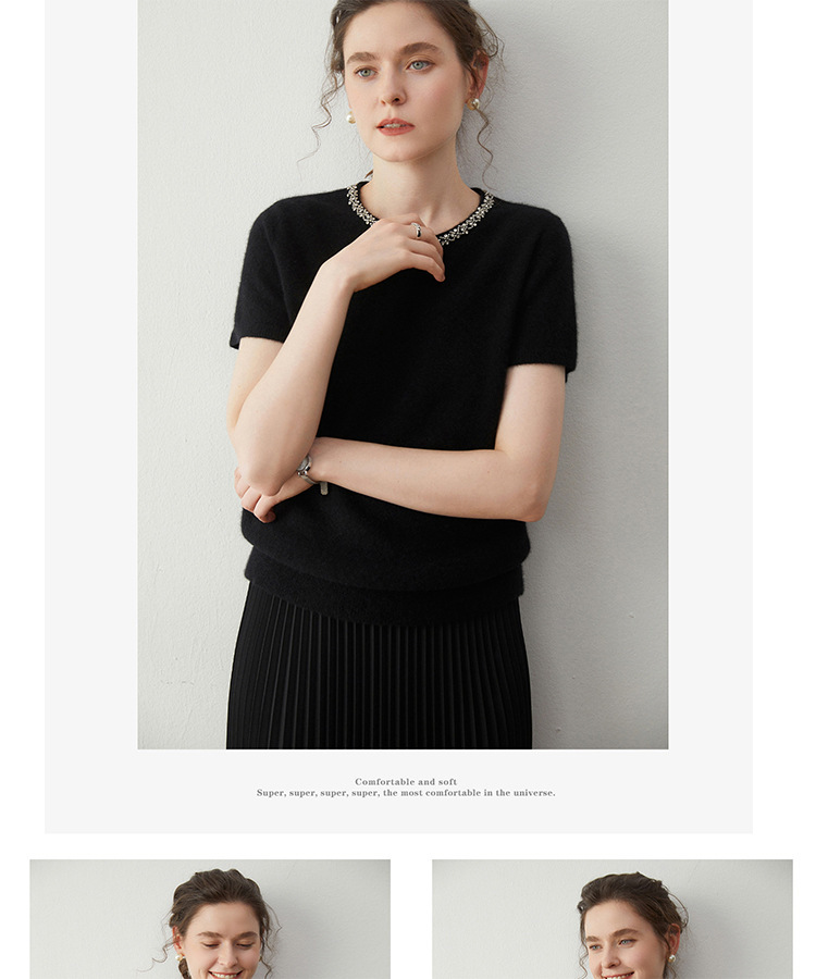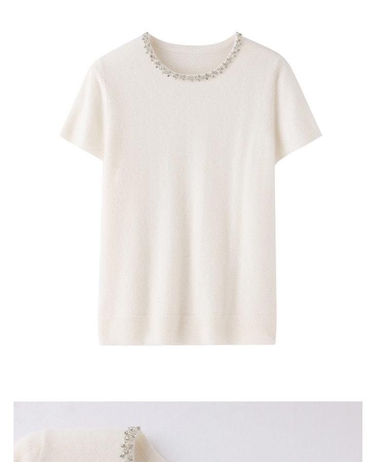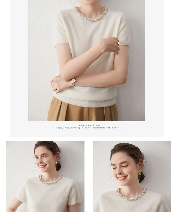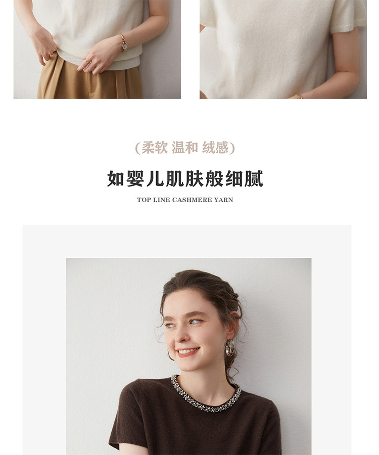 韩国新款山羊绒衫女轻奢镶钻气质显白短袖亲肤圆领针织毛衫打底衫