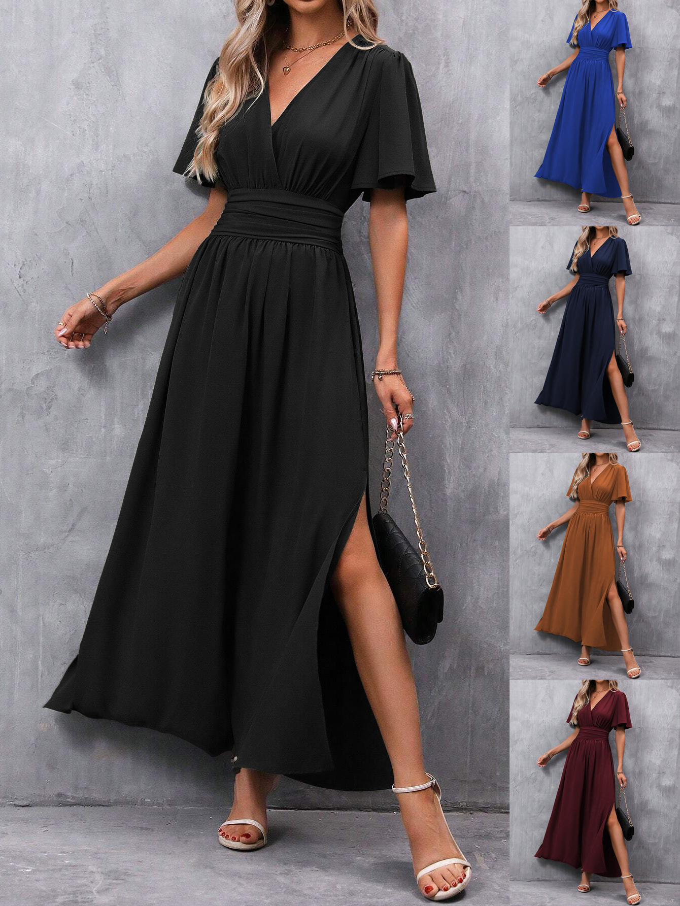 2025欧美跨境亚马逊TUME春夏季新款深V领荷叶袖纯色打揽连衣裙