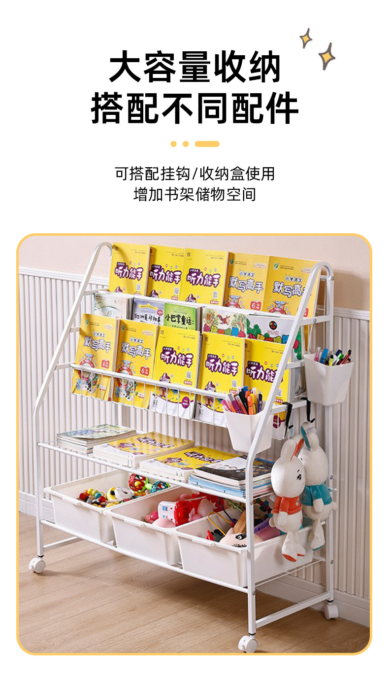 - 颜色:L3层绘本2层收纳架2个收纳盒(无挂桶)